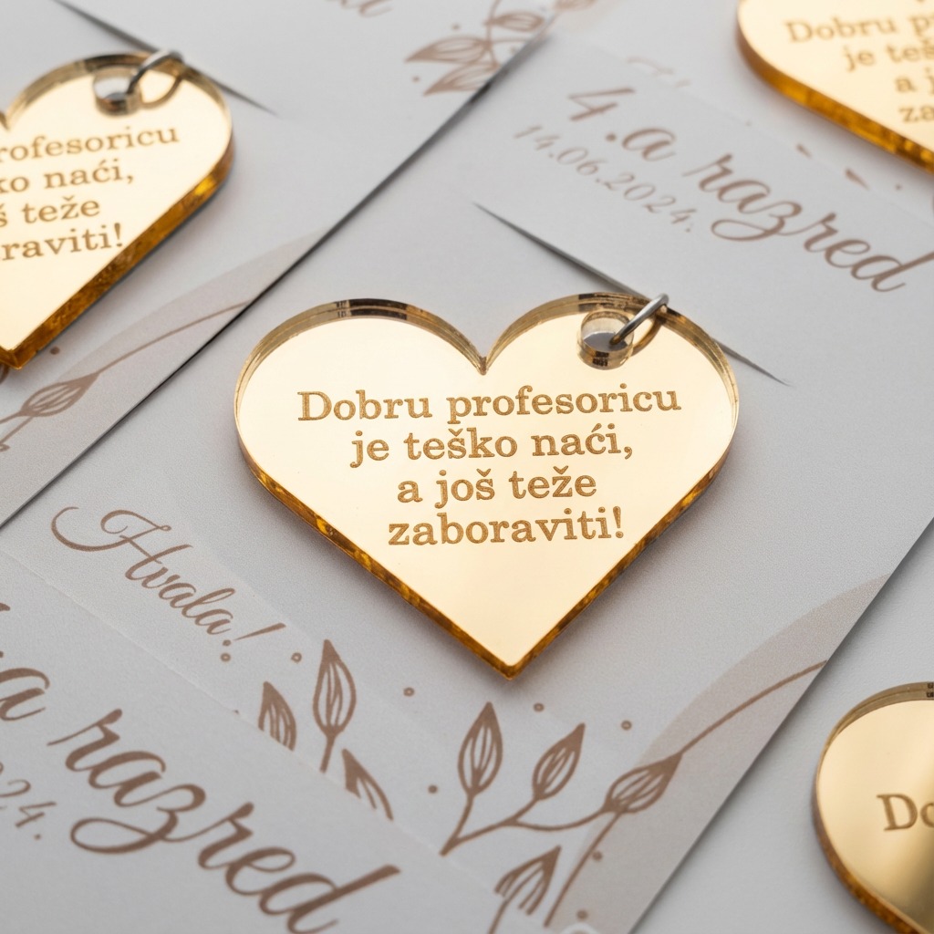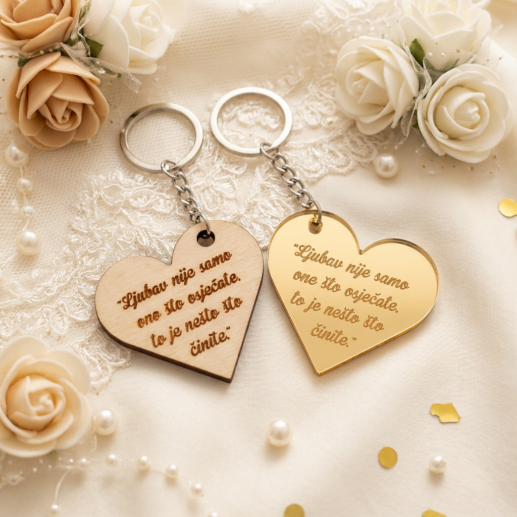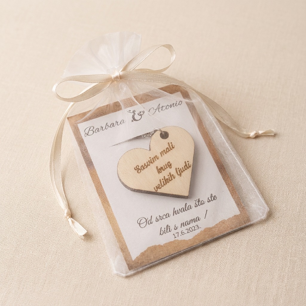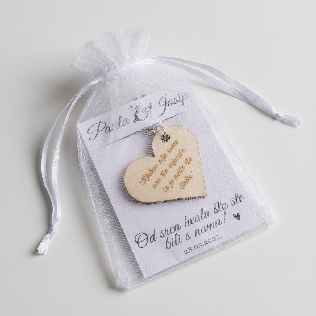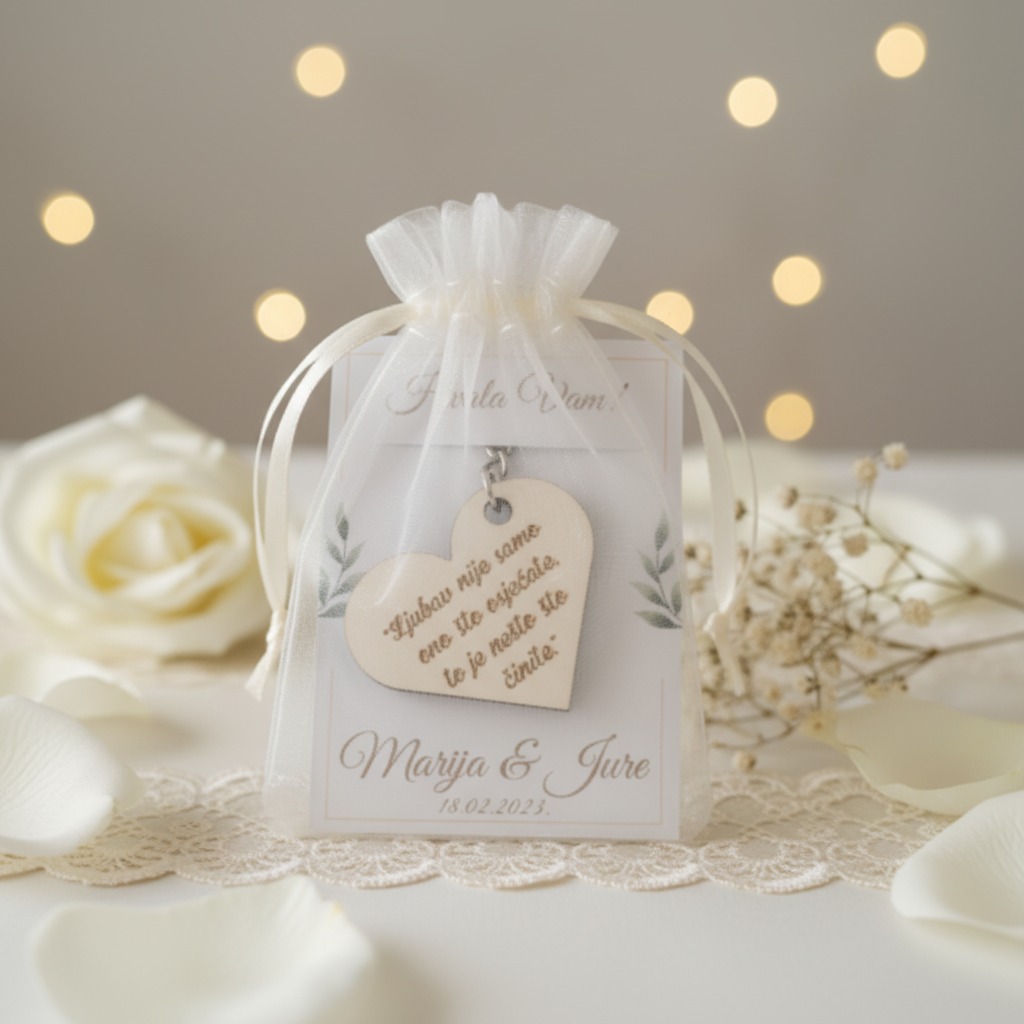 PRIVJESCI Personalizirani privjesak elegantna je i trajna uspomena na vaše vjenčanje.Privjesak kao zahvalnica gostima.Tekst na privjeske ide po vašoj želji. Privjesak dolazi sa kartončićem u organza vrećici.Naručiti možete putem mail-a, društvenih mreža ili putem Whatsapp-a na ikonici za brzi upit Drveni privjesak €1,10/kom Oblik po želji Kartončić sa dizajnom po želji Oblik i gravura po želji Organza vrećica Akril/pleksiglas €1,65/kom Oblik po želji Kartončić sa dizajnom po želji Oblik i gravura po želji Organza vrećica Galerija: Javi nam se preko društvenih mreža Facebook Instagram Kontakt Pošaljite nam upit Ime i prezime: Vaša e-mail adresa: Poruka: Pošalji Naši prijatelji: Rotacija partnera