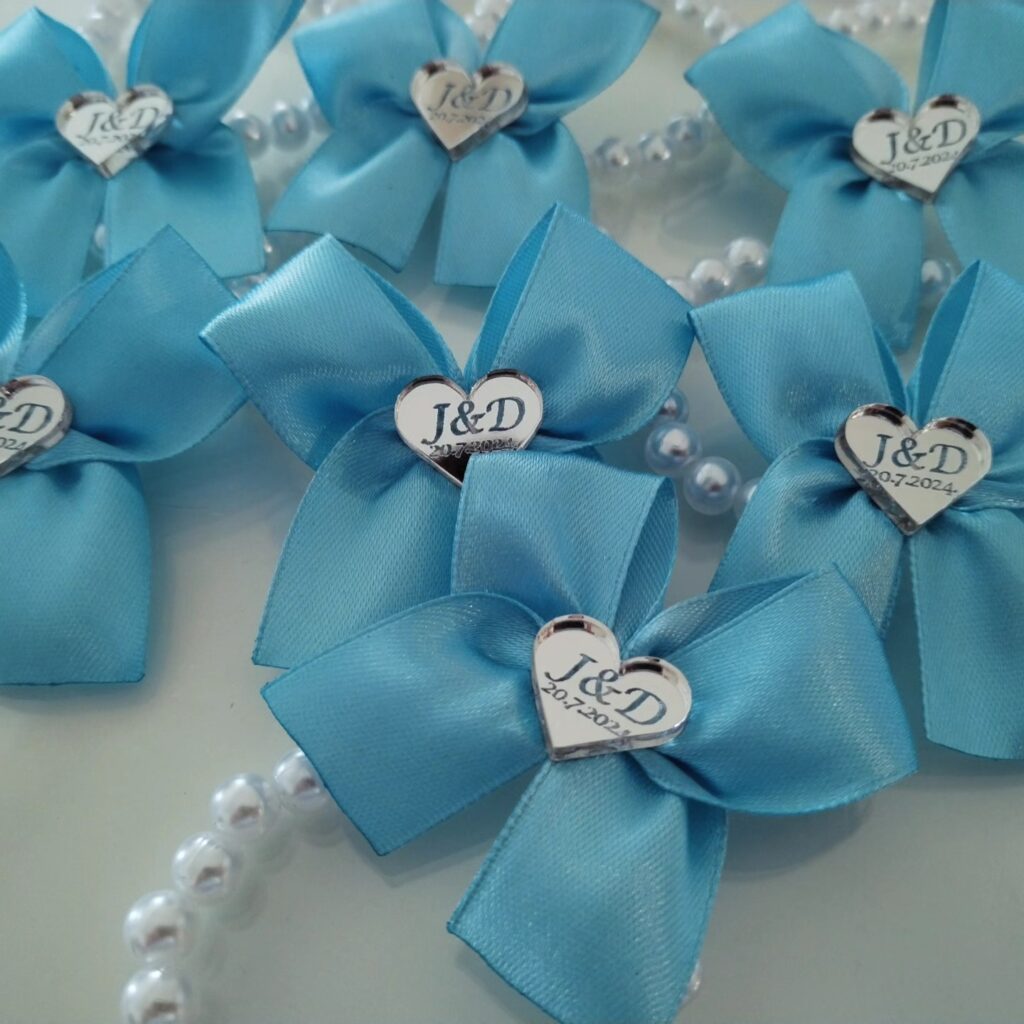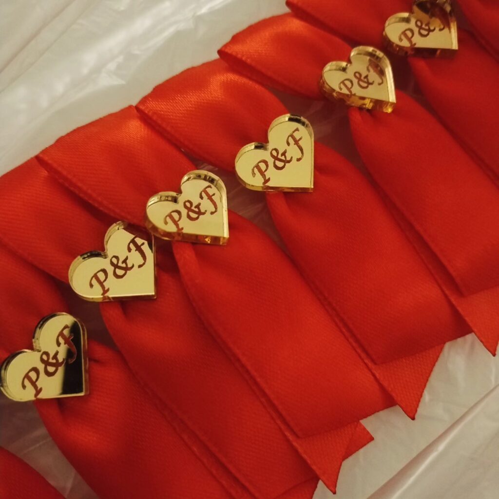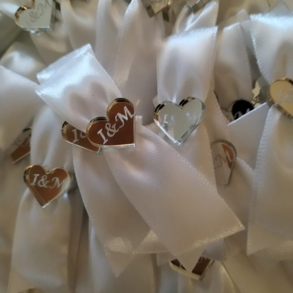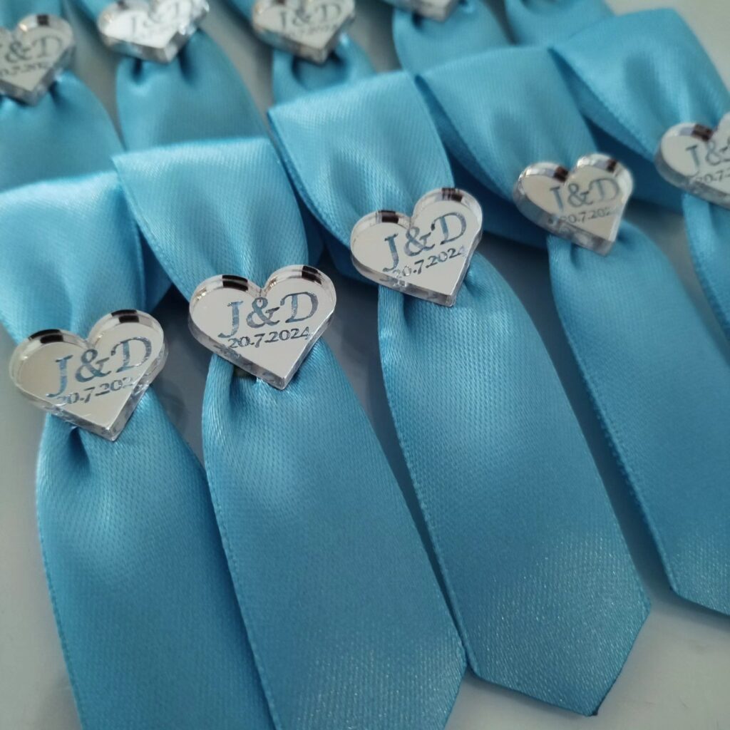 Pleksiglas (akril) dostupan je u zlatnoj ili srebrnoj varijanti, s preciznom gravurom po želji – imena, titule, kratke poruke ili simboli. Kombiniran je s nježnom satenskom trakicom i dekorativnim detaljima koji se skladno uklapaju u vjenčani stil.