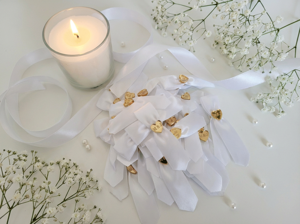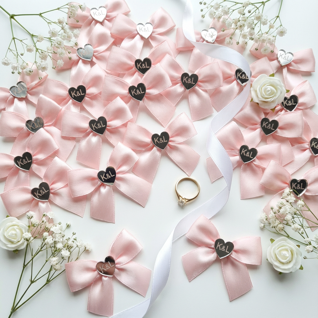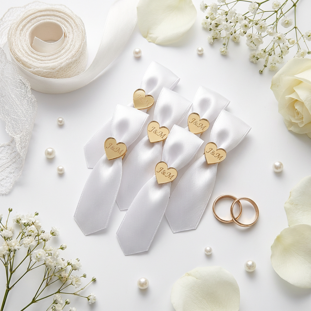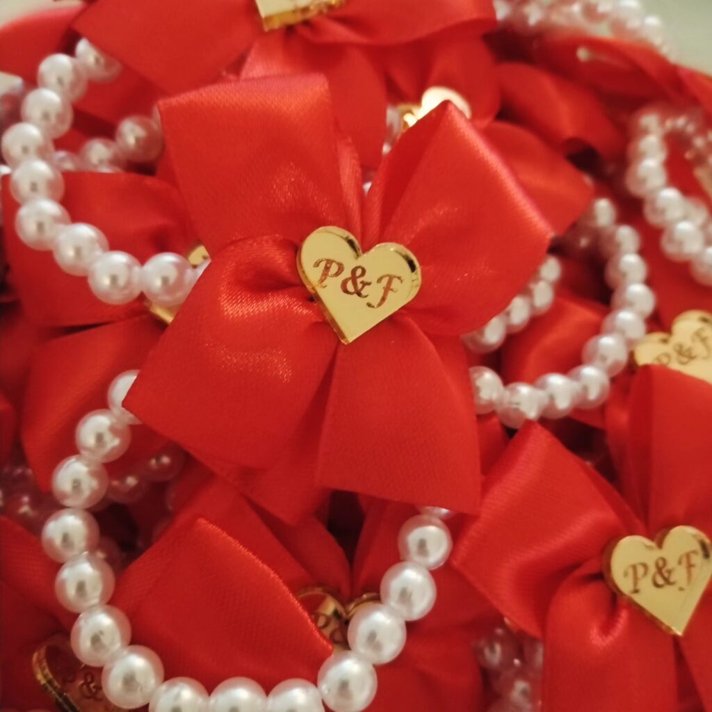 Pleksiglas (akril) dostupan je u zlatnoj ili srebrnoj varijanti, s preciznom gravurom po želji – imena, titule, kratke poruke ili simboli. Kombiniran je s nježnom satenskom trakicom i dekorativnim detaljima koji se skladno uklapaju u vjenčani stil.
