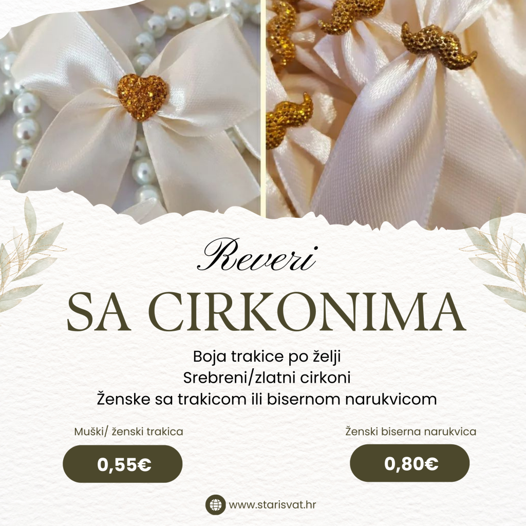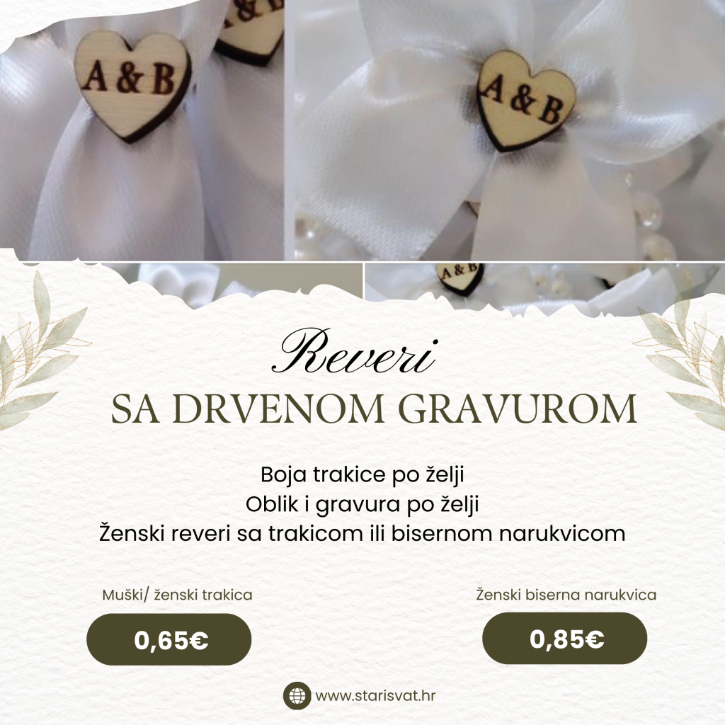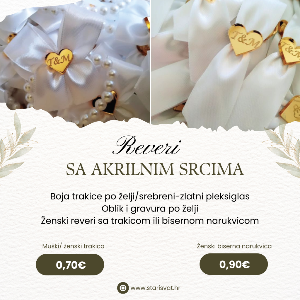 REVERI Akril rever Akrilni reveri za vjenčanje. Reveri se jednostavno pričvršćuju na tekstil pomoću trakice koja ne ostavlja tragove poslije korištenja.Mogućnost izrade u srebrenoj i zlatnoj boji. 0,65 €/kom Reveri sa cirkonima Muški i ženski reveri sa cirkonima. Kao cirkon može ići srce za ženske i “brk” za muške. U ponudi imamo revere koji se kod ženskih vežu satenskom trakom ili bisernom narukvicom. Boju cirkona (zlatna/srebrena) i trakice radimo po vašoj želji. Javite nam se s bojom koju želite. rever s satenskom trakom0,55 € rever s bisernom narukvicom0,80 € Rever sa graviranim drvenim srcem Muški i ženski reveri sa ugraviranim incijalima. Gravura radimo po vašoj želji te obliku (okrugli, srce, pravokutni…) U ponudi imamo revere koji se kod ženskih vežu satenskom trakom ili bisernom narukvicom. Boju trakice radimo po vašoj želji. Javite nam se s bojom koju želite. rever s satenskom trakom0,65 € rever s bisernom narukvicom0,85 € Reveri sa pleksiglas srcem i gravurom Muški i ženski reveri sa graviranim pleksiglas srcima. Dostupne boje pleksiglasa su srebrena i zlatna. U ponudi imamo revere koji se kod ženskih vežu satenskom trakom ili bisernom narukvicom. Boju pleksiglasa (zlatna/srebrena) i trakice radimo po vašoj želji. Javite nam se s bojom koju želite. rever s satenskom trakom0,70 € rever s bisernom narukvicom0,90 € Bogati reveri Bogati reveri za važne goste sa gravurom na drvetu ili pleksigalsu. Kum, kuma, mama, tata, brat, sestra…. U ponudi imamo revere koji se kod ženskih vežu satenskom trakom ili bisernom narukvicom. Boju pleksiglasa (zlatna/srebrena) i trakice radimo po vašoj želji. Javite nam se s bojom koju želite. rever s satenskom trakom2,50 € rever s bisernom narukvicom3,00 €