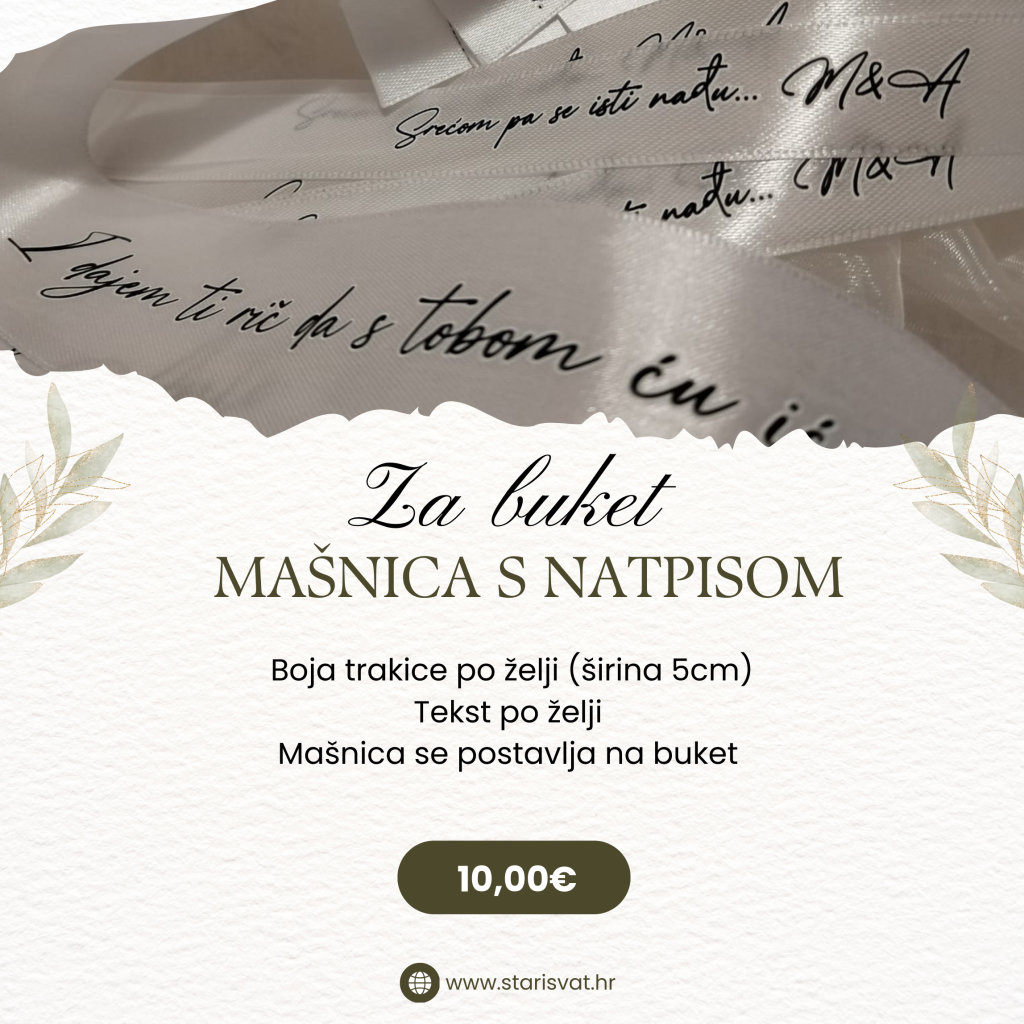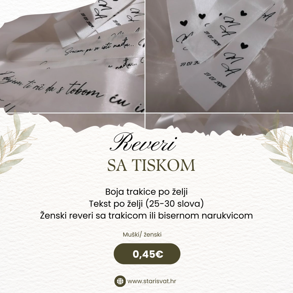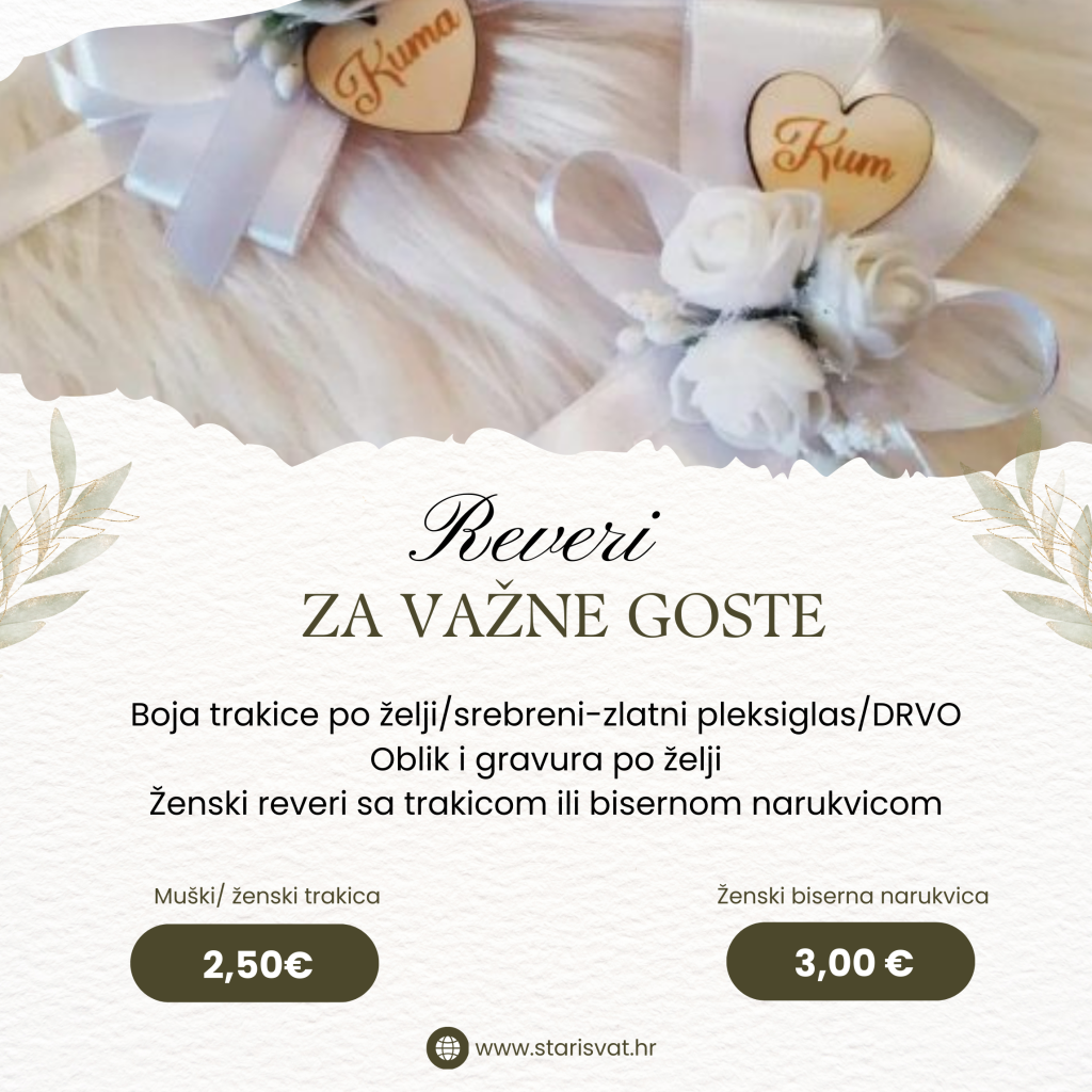 REVERI Akril rever Akrilni reveri za vjenčanje. Reveri se jednostavno pričvršćuju na tekstil pomoću trakice koja ne ostavlja tragove poslije korištenja.Mogućnost izrade u srebrenoj i zlatnoj boji. 0,65 €/kom Reveri sa cirkonima Muški i ženski reveri sa cirkonima. Kao cirkon može ići srce za ženske i “brk” za muške. U ponudi imamo revere koji se kod ženskih vežu satenskom trakom ili bisernom narukvicom. Boju cirkona (zlatna/srebrena) i trakice radimo po vašoj želji. Javite nam se s bojom koju želite. rever s satenskom trakom0,55 € rever s bisernom narukvicom0,80 € Rever sa graviranim drvenim srcem Muški i ženski reveri sa ugraviranim incijalima. Gravura radimo po vašoj želji te obliku (okrugli, srce, pravokutni…) U ponudi imamo revere koji se kod ženskih vežu satenskom trakom ili bisernom narukvicom. Boju trakice radimo po vašoj želji. Javite nam se s bojom koju želite. rever s satenskom trakom0,65 € rever s bisernom narukvicom0,85 € Reveri sa pleksiglas srcem i gravurom Muški i ženski reveri sa graviranim pleksiglas srcima. Dostupne boje pleksiglasa su srebrena i zlatna. U ponudi imamo revere koji se kod ženskih vežu satenskom trakom ili bisernom narukvicom. Boju pleksiglasa (zlatna/srebrena) i trakice radimo po vašoj želji. Javite nam se s bojom koju želite. rever s satenskom trakom0,70 € rever s bisernom narukvicom0,90 € Bogati reveri Bogati reveri za važne goste sa gravurom na drvetu ili pleksigalsu. Kum, kuma, mama, tata, brat, sestra…. U ponudi imamo revere koji se kod ženskih vežu satenskom trakom ili bisernom narukvicom. Boju pleksiglasa (zlatna/srebrena) i trakice radimo po vašoj želji. Javite nam se s bojom koju želite. rever s satenskom trakom2,50 € rever s bisernom narukvicom3,00 €